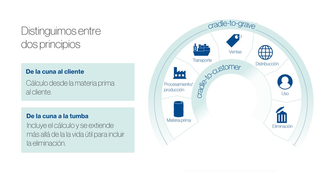 Todos los procesos que intervienen en la vida de un producto se incluyen en el cálculo de su huella de carbono. En nuestros cálculos, diferenciamos entre los principios "de la cuna al cliente" y "de la cuna a la tumba". Nuestro objetivo es utilizar estos datos para identificar el potencial de ahorro (por ejemplo, a través del análisis de puntos calientes) y para comunicar nuestros resultados de sostenibilidad tanto interna como externamente. El cálculo también puede servir de base para futuros procesos de diseño y desarrollo de productos.