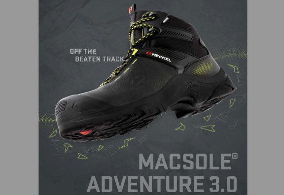 Los nuevos modelos de la gama MACSOLE® ADVENTURE 3.0 combinan las propiedades de elasticidad natural del caucho con la nueva tecnología MACABSORB. Las inserciones de espuma EVA se colocan en el metatarso y el talón para una mejor absorción de impactos superior a los requisitos de la norma, mejorando significativamente la comodidad de uso y reduciendo la fatiga en los pies.