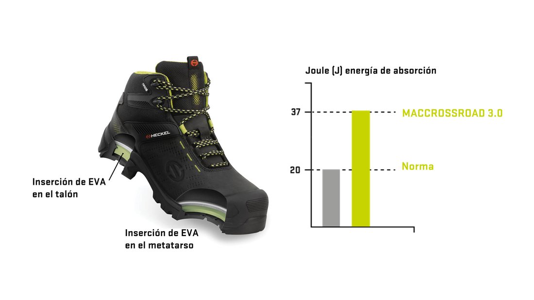 Equipado con la nueva tecnología MACABSORB, el MACCROSSROAD 3.0 ofrece un 85% más de absorción de impactos que lo especificado por la norma EN ISO 20345, para una comodidad confiable en todas las superficies.