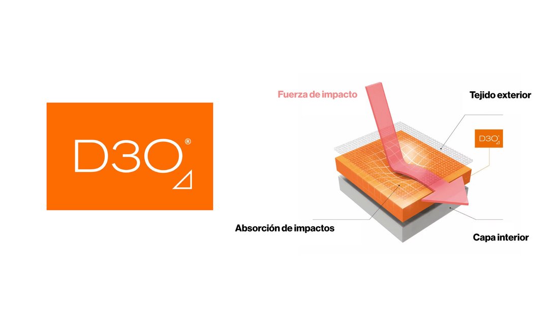 El D3O® es un material celular elástico formado por moléculas "flotantes". En su estado original, su textura es muy fluida. En caso de impacto, estas moléculas tienen la capacidad de unirse para volverse instantáneamente -en menos de 10 milisegundos- rígidas, como un sólido, para absorber y dispersar la energía producida. Esta reacción no sólo es inmediata, sino también proporcional a la fuerza del impacto. Cuanto más violento sea el impacto, más reaccionarán las moléculas, proporcionando así la mejor protección posible. En cuanto pasa el impacto, las moléculas vuelven a su estado de alta fluidez.