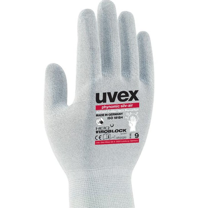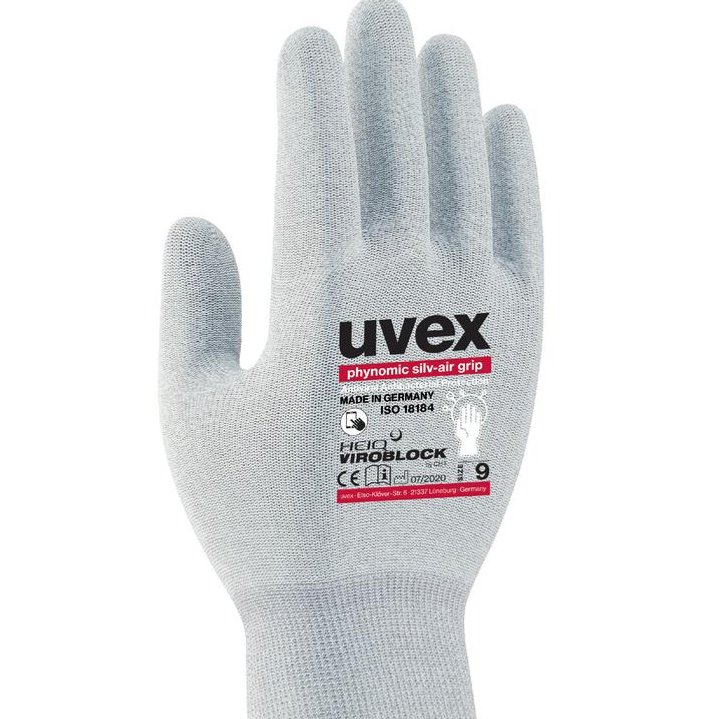 Una prueba de las propiedades antivirales de acuerdo con la norma ISO 18184: 2019-06 mostró que el guante uvex phynomic silv-air supera con creces los requisitos y la carga viral se minimiza en minutos. En el estudio en el que se incluyó el virus CCov - VR 809 (de la familia SARS-CoV-2) encontró que un tipo de virus canino con una envoltura lipídica se descompone de manera particularmente rápida por la tecnología HEIQ VIROBLOCK CHT. El covid-19 es causado por un virus de la misma familia. HEIQ VIROBLOCK de CHT es una de las primeras tecnologías textiles del mundo que se ha demostrado en un laboratorio que es eficaz contra el SARS-CoV-2. Las pruebas realizadas por el Instituto Peter Doherty de Infección e Inmunidad en Melbourne, Australia (Instituto Doherty) mostraron que el tejido tratado logró una reducción del virus del 99,9%. Esta eficacia de los guantes se volvió a demostrar en pruebas independientes realizadas de acuerdo con ISO 18184: 2019-06 e ISO 20743: 2016.