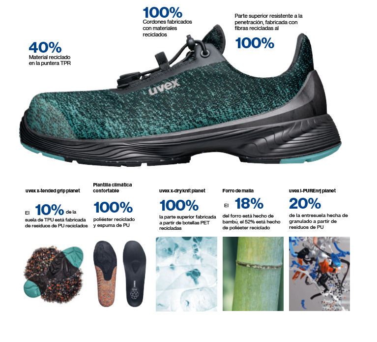 Gracias a la utilización de materiales reciclados y de origen biológico, hemos podido reducir la huella de CO2 en1,5 kg, es decir, un 17,9%, en comparación con nuestro modelo uvex 1 G2 normal (n.º de art. 68342, huella de CO2 de 8,4 kg)..